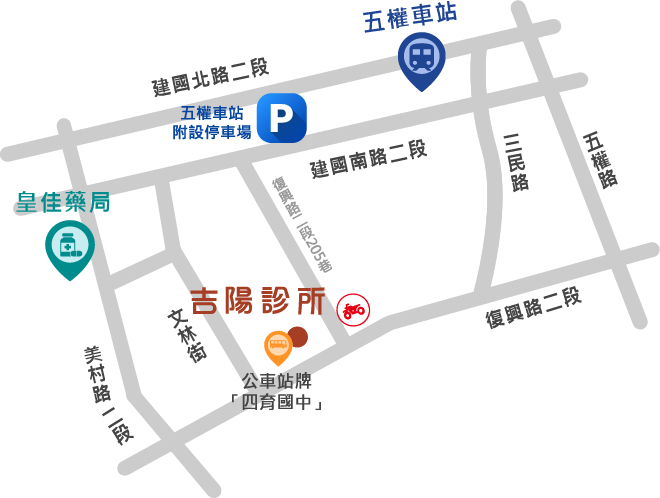 - 於高鐵台中站公車站牌,搭乘100復興幹線,於「四育國中」站牌下車,即可見到位於復興路另一側的吉陽診所。(診所正對全聯福利中心)。